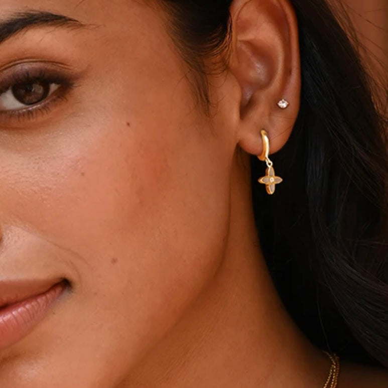 Desert Flower Huggie with Mother of Pearl and White Topaz details.