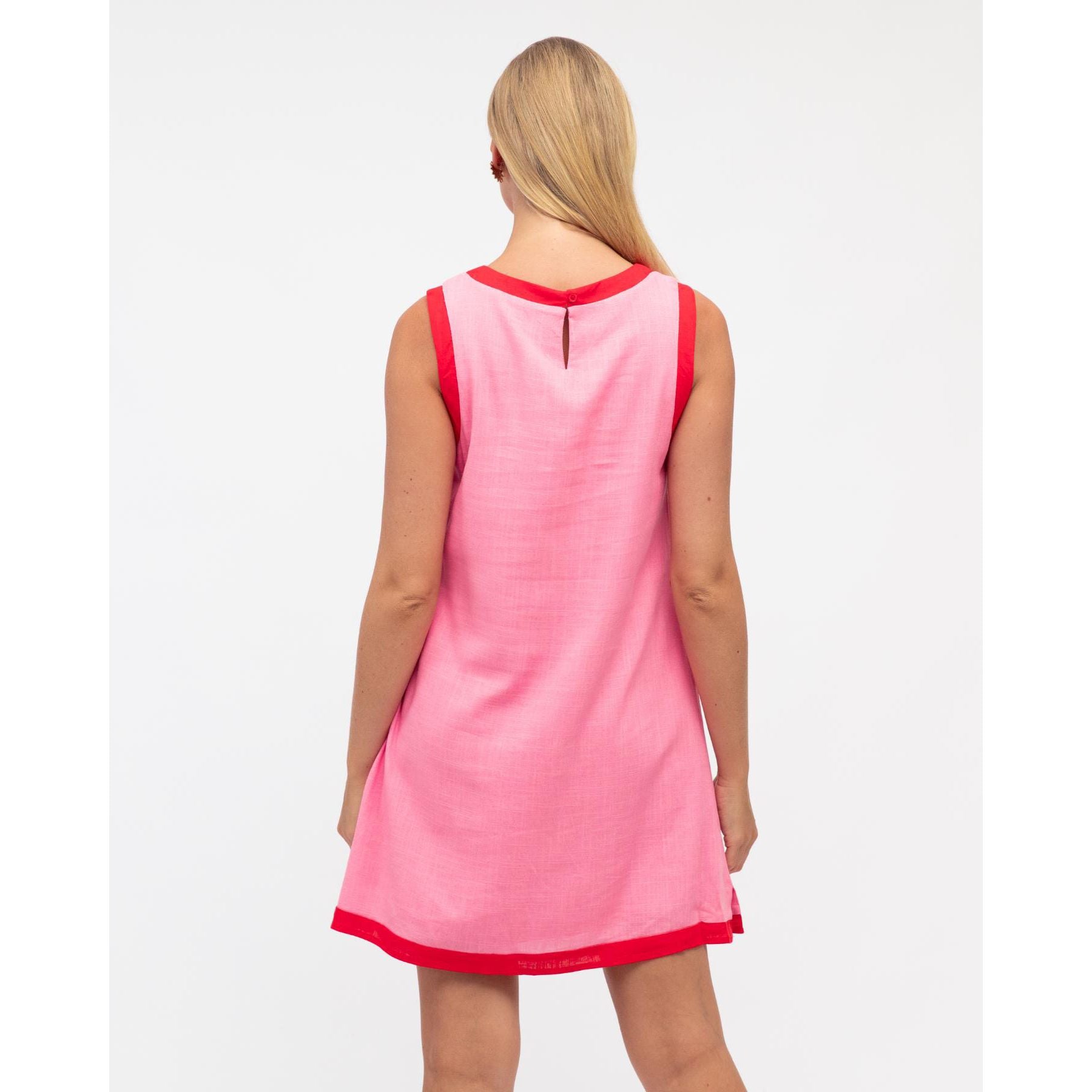 Effortlessly chic and playfully modern, the Jude sleeveless shift dress is a go-to piece for sunny days and casual occasions. Crafted in a soft pink hue with bold red contrast trim along the neckline, armholes, and hem, it strikes the perfect balance between classic and contemporary style.