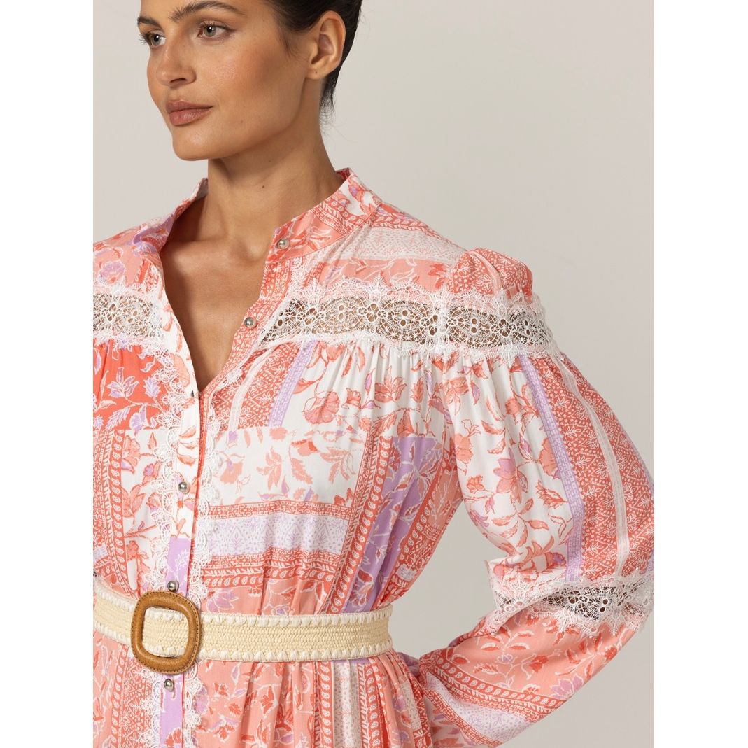 The Gwen Long Dress is a flowing, boho-chic maxi dress featuring a soft blend of warm coral, blush pink, and white tones in a patchwork-inspired print. Its lightweight fabric drapes gracefully, creating a romantic and feminine silhouette. Delicate lace trim accents the sleeves, bodice, and tiered skirt, adding intricate texture and vintage charm. The dress includes a subtle waistband that gently shapes the figure without compromising comfort.