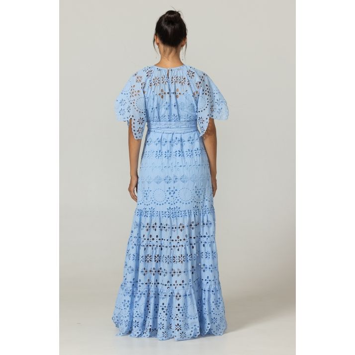 The Sable Dress is a light blue maxi dress crafted in delicate broderie anglaise. It features a round neckline, short puff sleeves, a removable tie belt, and a flowing tiered skirt for an elegant, feminine silhouette perfect for summer soirées .