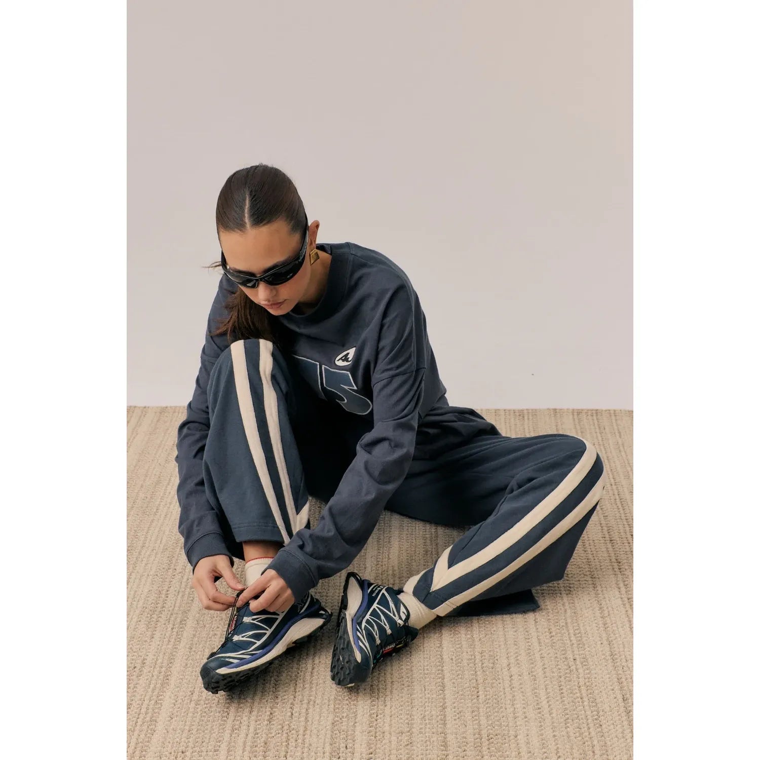 The Races Trackpant in Washed Black offers an effortless wide-leg silhouette made for everyday wear. Crafted from 100% premium cotton brushed fleece, this style features side pockets, contrasting velour trims that elongate the leg, and side split detail at the ankle. With an elasticised waistband, this trackpant is both flattering and comfortable. Pair yours with the Speedway Long Sleeve Tee in Maritime Blue, or the matching Daytona Long Sleeve Top in Washed Black a relaxed everyday look.