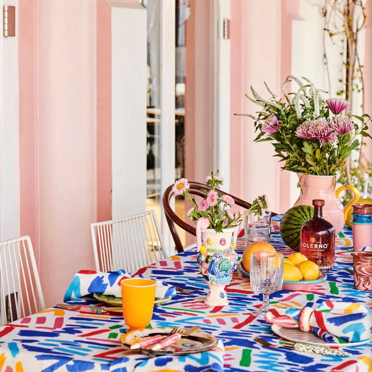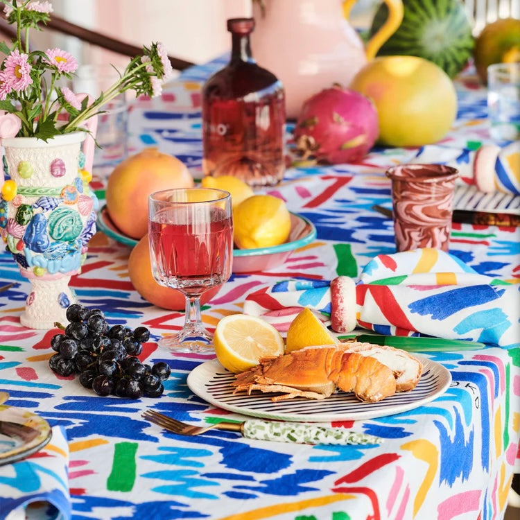 Our Kip&Co x Ken Done Little Tackers print features bold primary coloured sailboats on the Sydney harbour seas. It's a beauty and sparks the 80s Aussie art nostalgia that Ken Done is known for. Bring on the festivities and feasts with the jazziest tablecloths around. Made from 100% French flax linen, our tablecloths are luscious and hardy, and bursting with life.