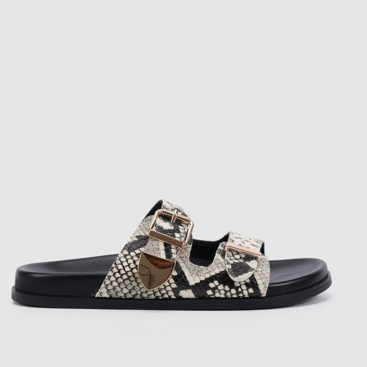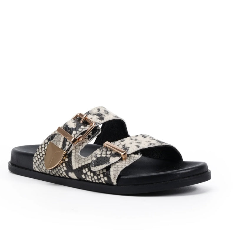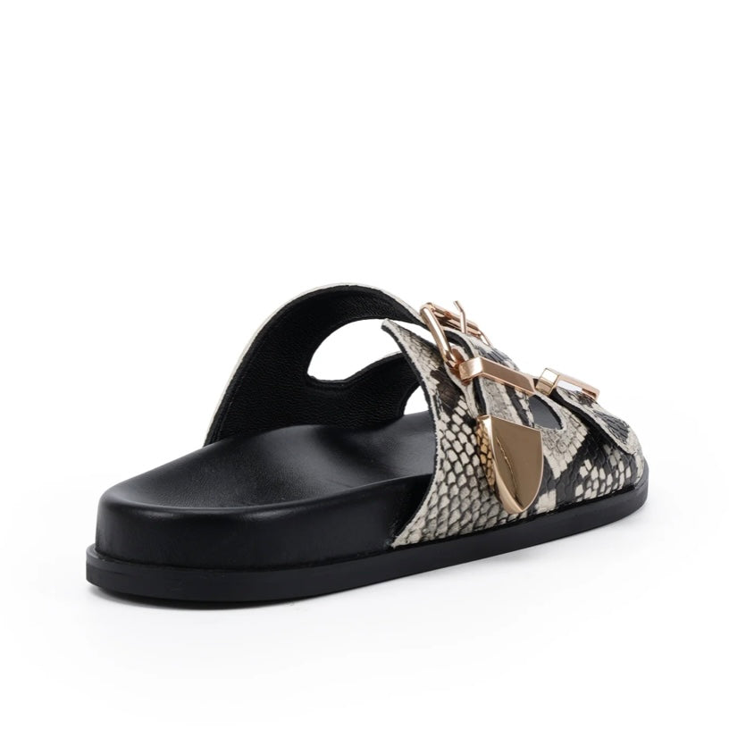 Step into effortless sophistication with Sina, a contemporary slide that blends utility with glamour. Featuring bold dual buckles with statement gold accents and a contoured footbed for all-day comfort, Sina is your elevated go-to for laid-back luxury. Perfect for pairing with relaxed tailoring or breezy summer dresses.