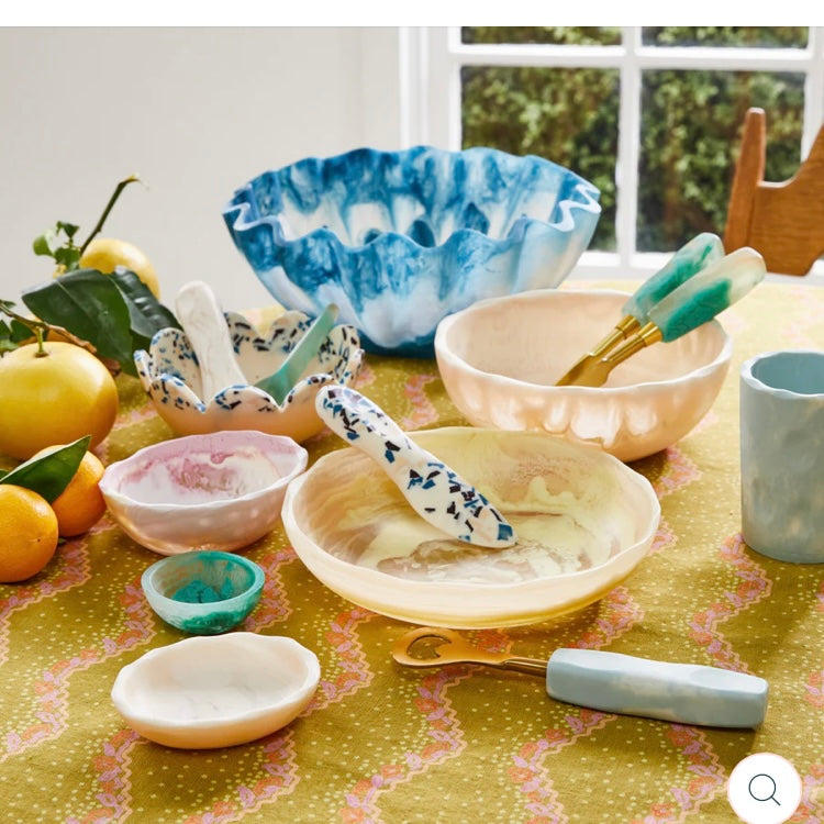 “Whether you’re entertaining or just enjoying daily dinners with the family, our resin tableware makes every meal an experience to remember. The Venus Bowl makes for the perfect elevated fruit bowl or a show-stopping centrepiece at dinner parties, particularly when filled with a delicious salad and paired with our Inez Servers. Our stunning Taffy colourway swirls together navy tones for a pop of colour.” – Phoebe’s Style Notes