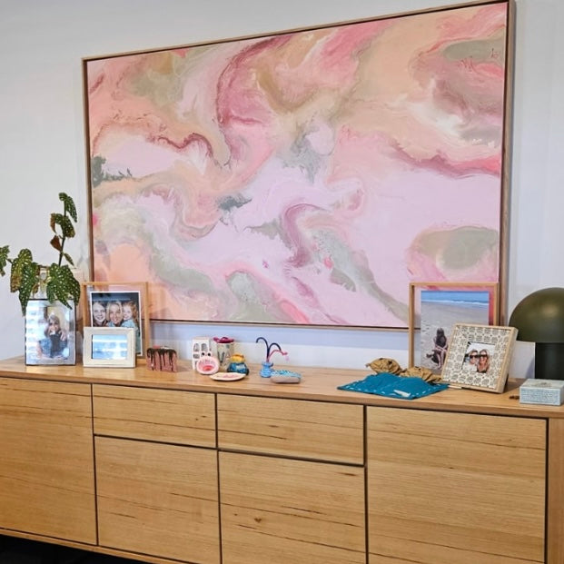 Measuring 150×100 centimeters, the artwork is a testament to the mastery of acrylic and ink, dually noted the inspiration an ontrend colour palette.